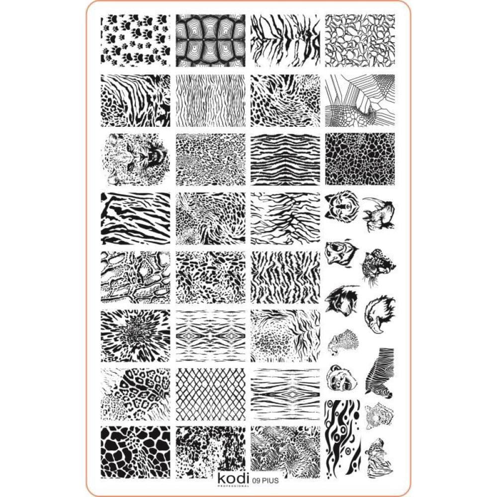 Пластина №09 з серії Plus size виконана з металу. Пластина призначена для створення нігтьового дизайну з природними орнаментами. Пластина також містить малюнки тварин – вовка, носорога, зебри та інших.
